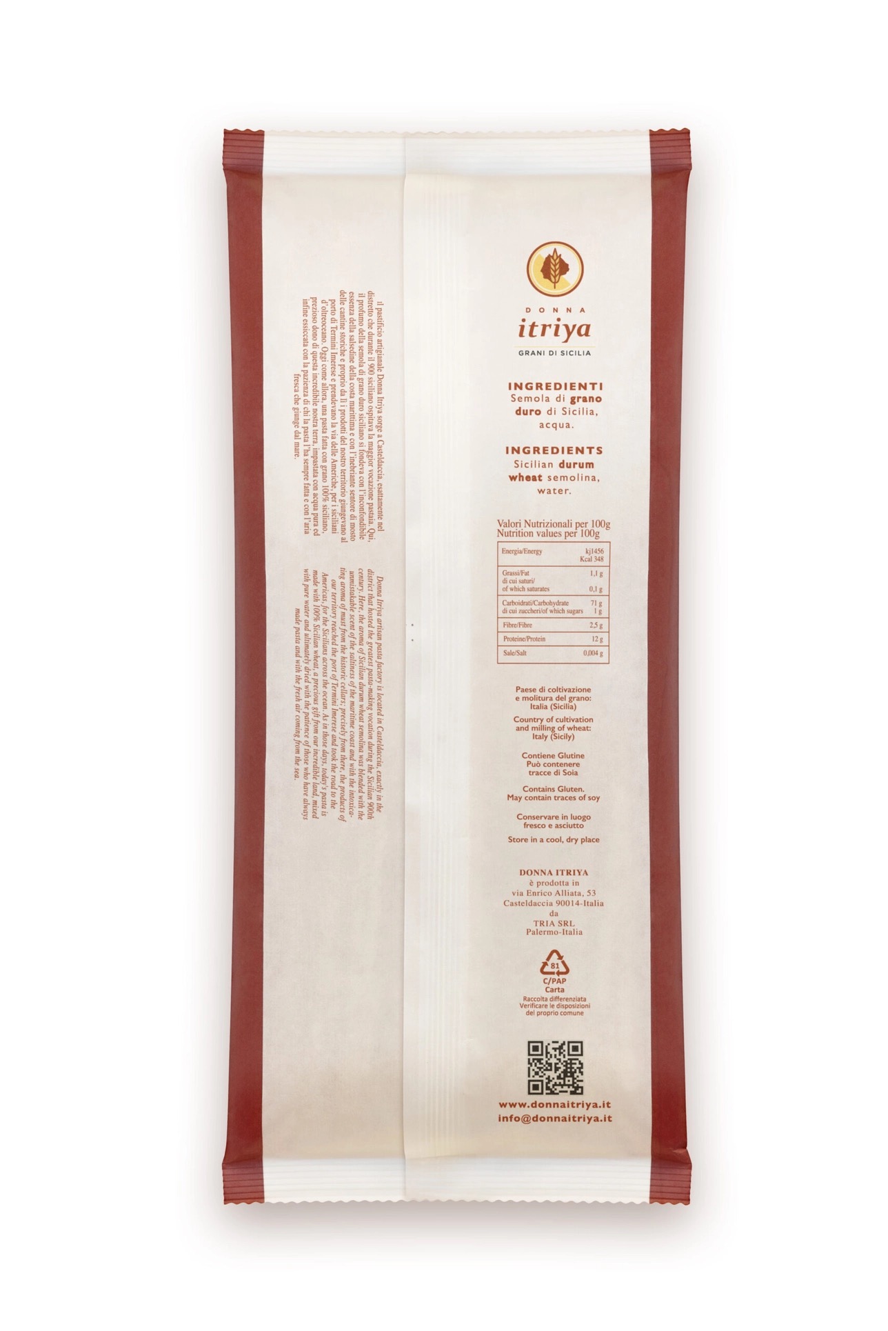 Verwendet wird ausschließlich sizilianischer Hartweizengrieß. Der Teig wird durch Bronzeformen gepresst, wodurch die Oberfläche leicht rau bleibt und Saucen wunderbar aufnimmt. Getrocknet wird sehr langsam bei niedriger Temperatur. Nach zwölf Minuten Kochzeit entsteht eine Pasta mit fester Struktur, mit Biss und mit einem ehrlichen Weizenduft.