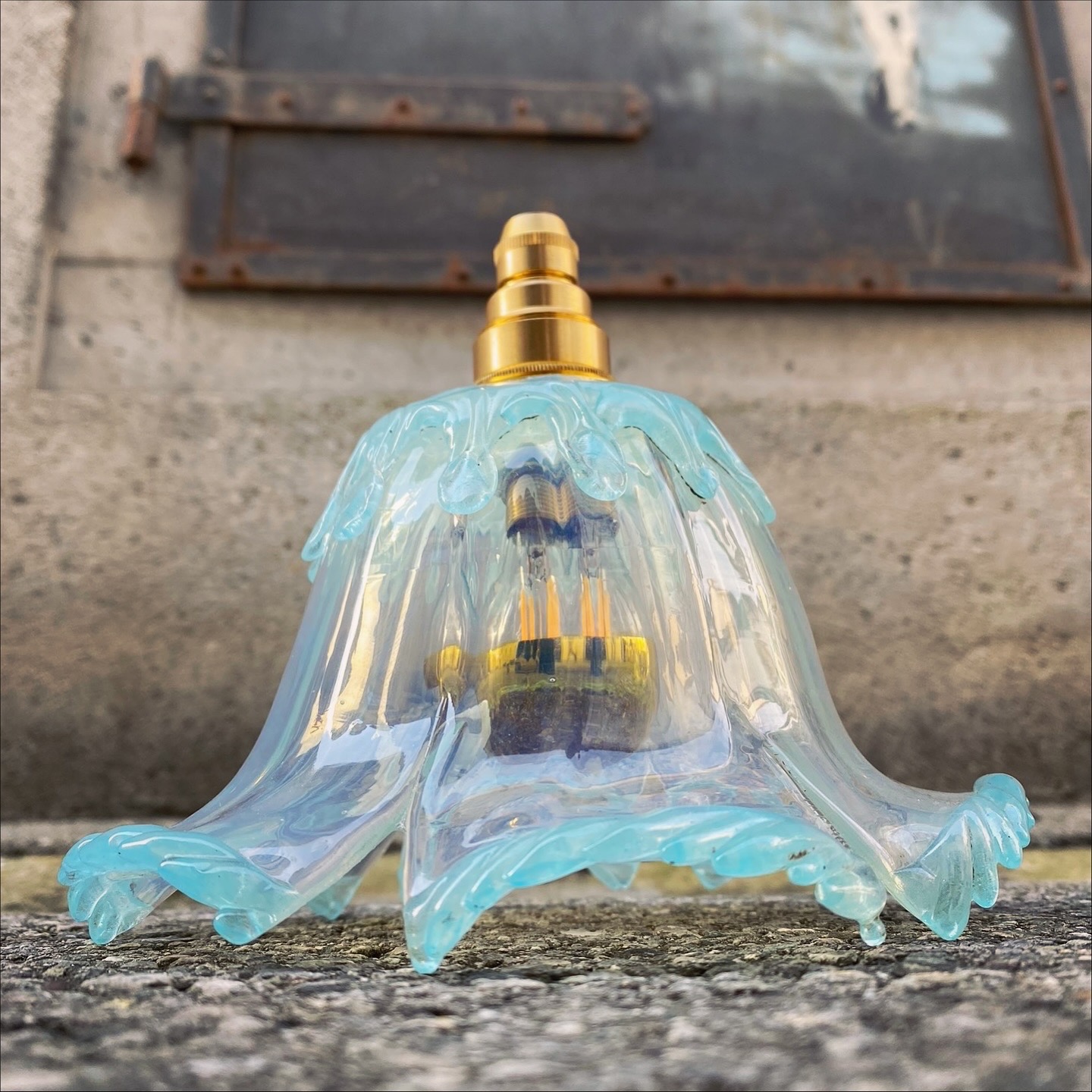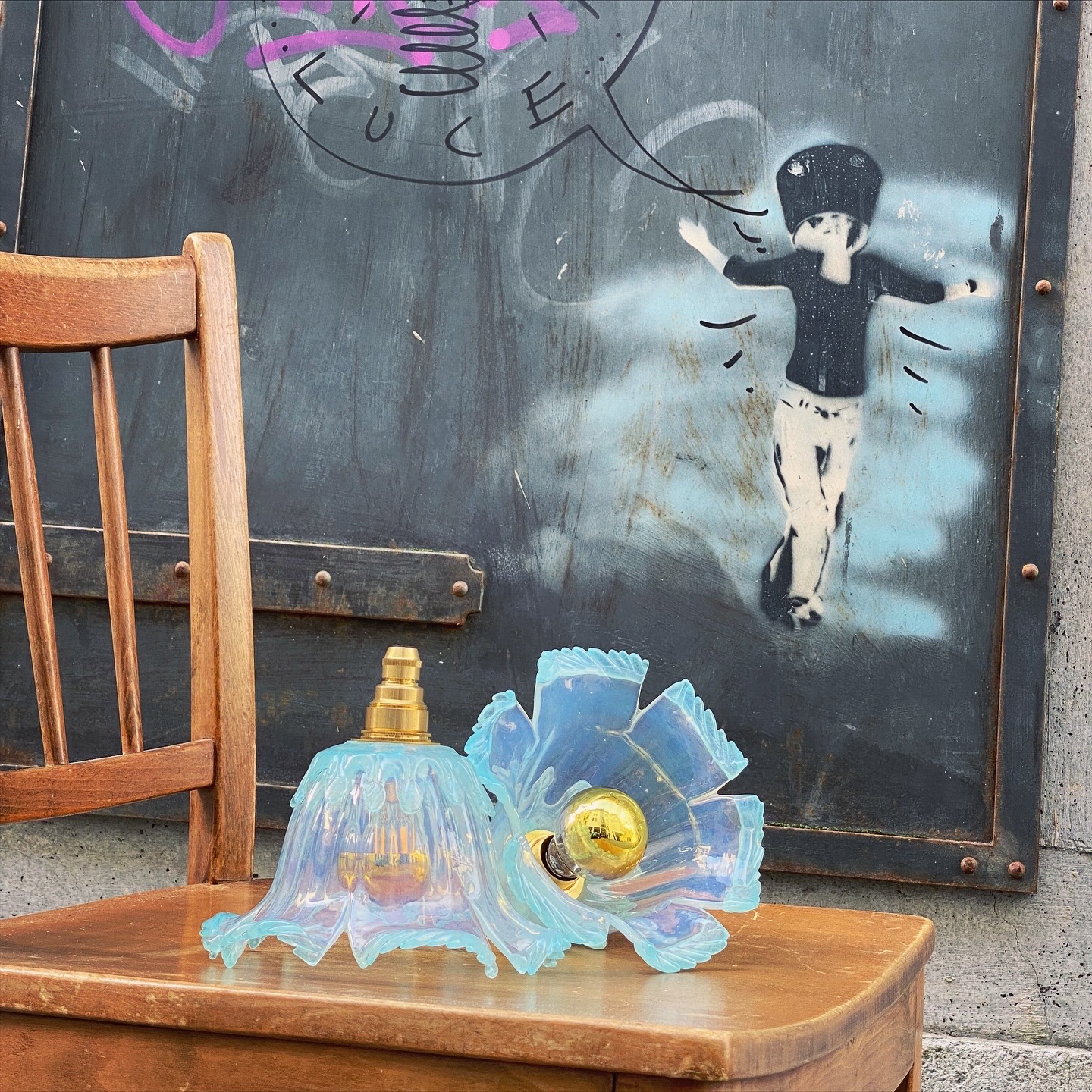 Diese beiden Lampen sind ein kleines Stück Glaskunst: Die Schirme sind aus dem Jugendstil – zart irisierend, in Wellen geformt und mit einem fast blütenartigen Charakter. Sie erinnern an Wasser, an Blütenblätter, an eine Zeit, in der Glas nicht nur funktional gestaltet wurde.