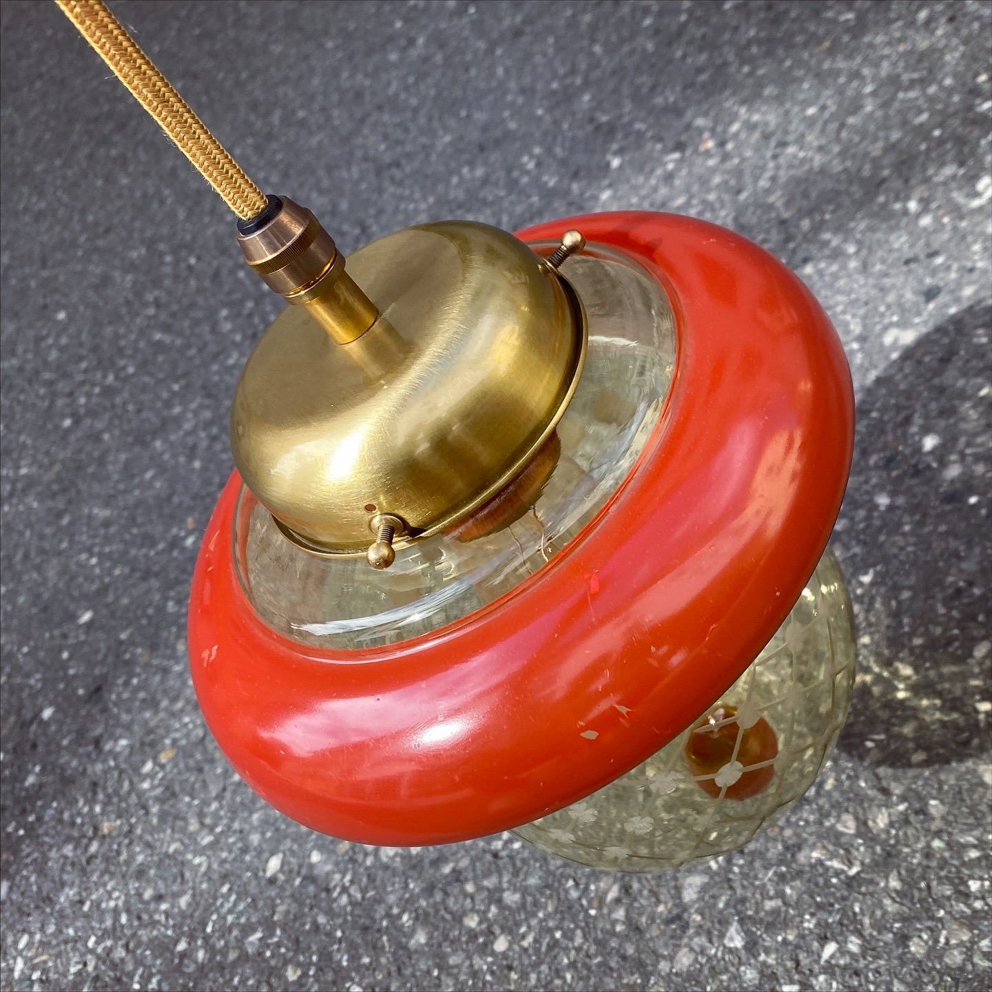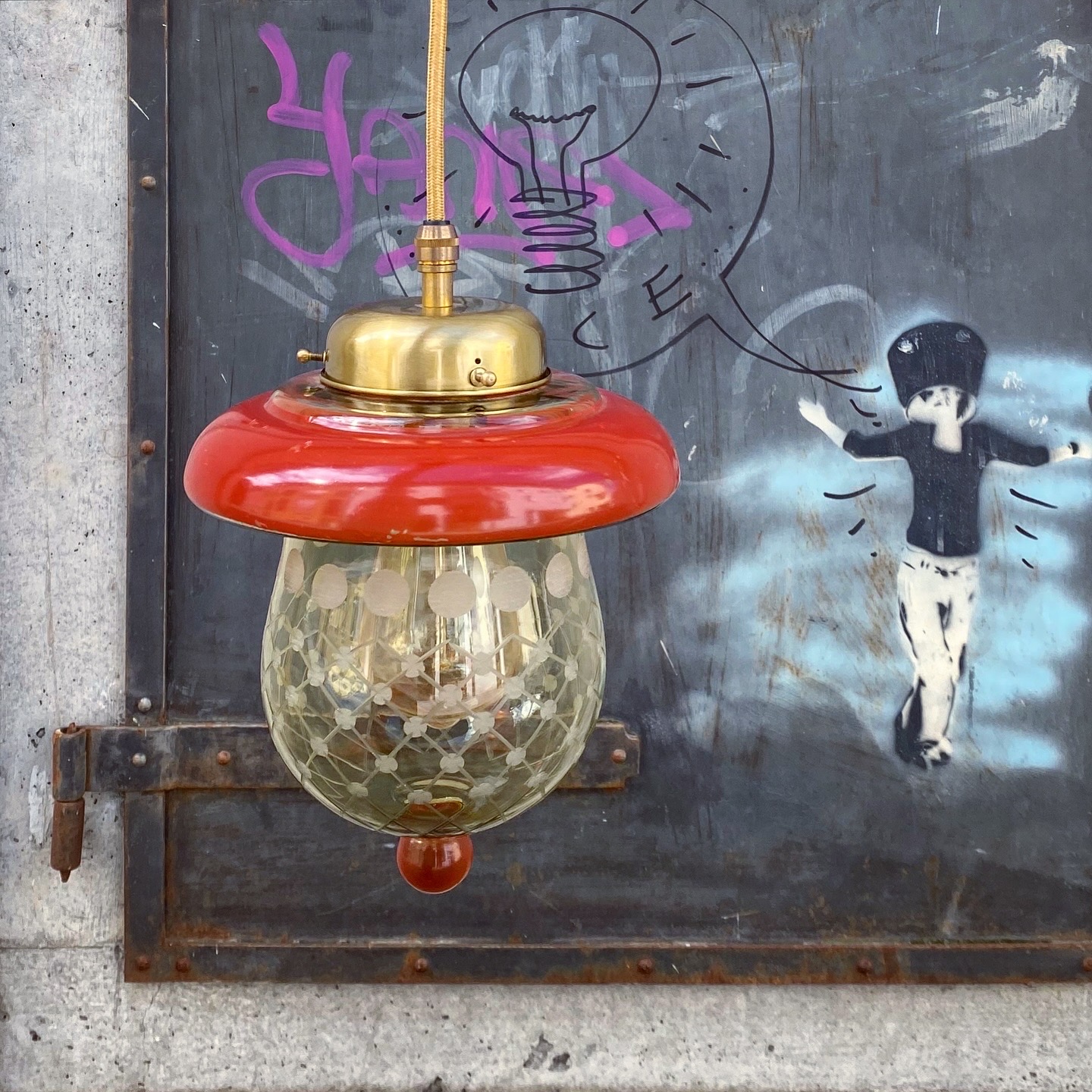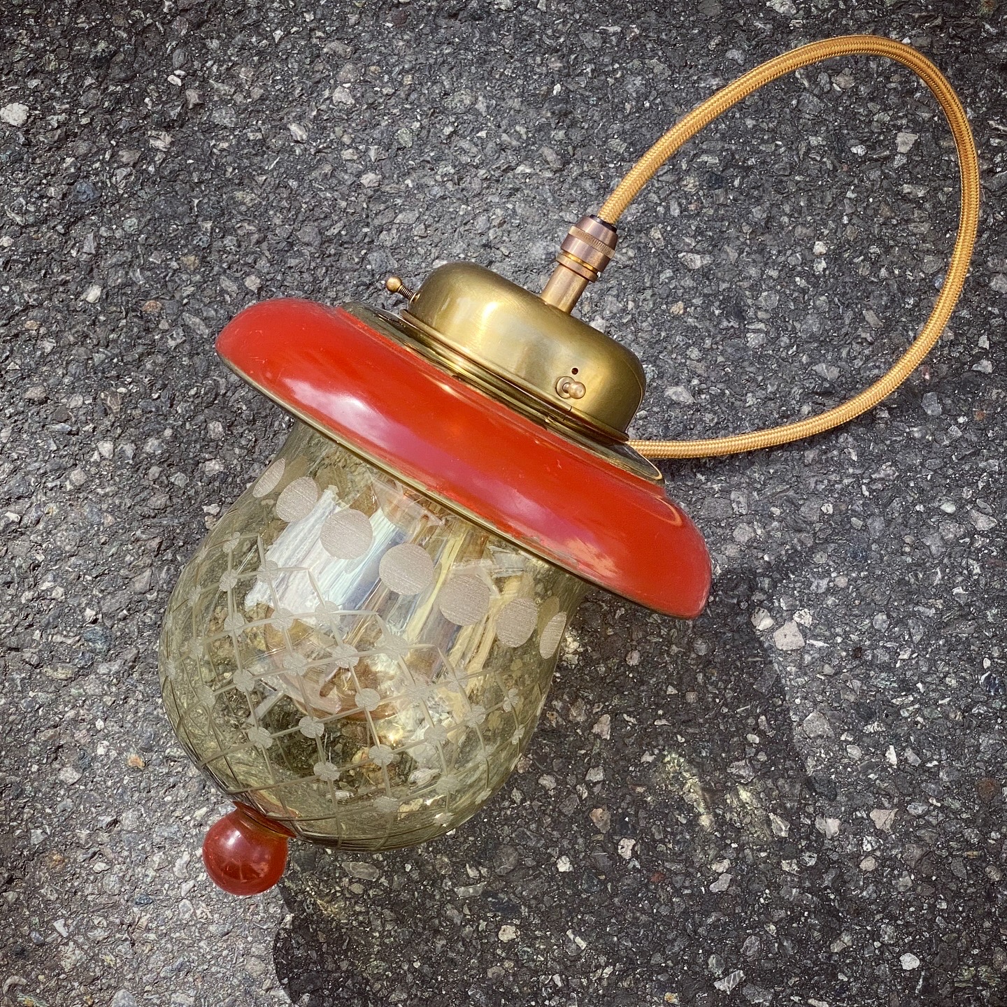 Die Messingfassung bringt einen Hauch von Eleganz hinein, während die handwerklich wirkende Gravur im Glas das Licht in sanfte Muster zerlegt. Und unten setzt ein roter Glasknopf noch das i-Tüpfelchen.
