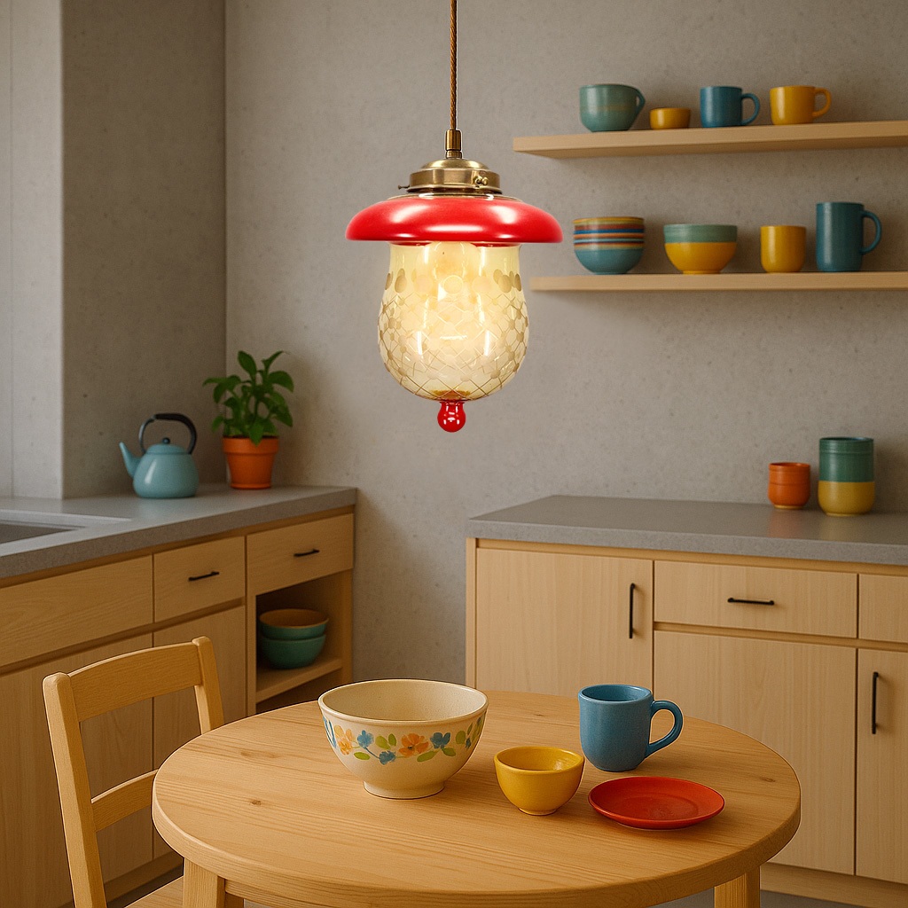 Über einem runden Esstisch in einer Küche, die nach Holz, Kaffee und frischem Gebäck riecht. Die roten Glasakzente passen wunderbar zu buntem Geschirr oder einem farbenfrohen Teppich darunter. Abends wirft sie ein warmes Licht.